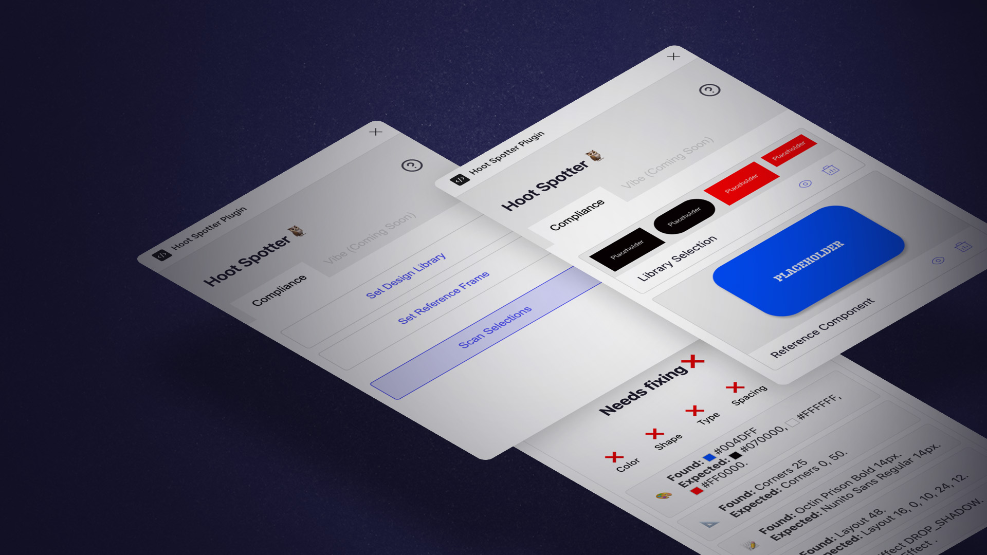 Hoot Spotter is a Figma plugin designed to help designers quickly assess whether their work complies with a defined design system visually, interactively, and without leaving Figma. Hoot was created to address a gap in tooling where teams lacked fast, UI-native feedback for design system adherence, leading to bloated reviews and inconsistent delivery.